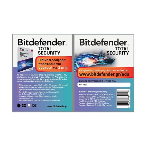 Το Bitdefender Total Security, σου παρέχει την καλύτερη προστασία από κακόβουλα προγράμματα σε όλες τις πλατφόρμες. Προστάτεψε τη συσκευή σου για Windows, Mac OS, iOS και Android με ένα μοναδικό σε χαρακτηριστικά προϊόν που είναι εκπληκτικά ισχυρό και εύκολο στη χρήση. Χρησιμοποίησε τον λογαριασμό σου Bitdefender Central για να διαχειριστείς την ασφάλεια της συσκευής σου όπου και αν βρίσκεσαι. «Απευθύνεται για Ακαδημαϊκή Χρήση»