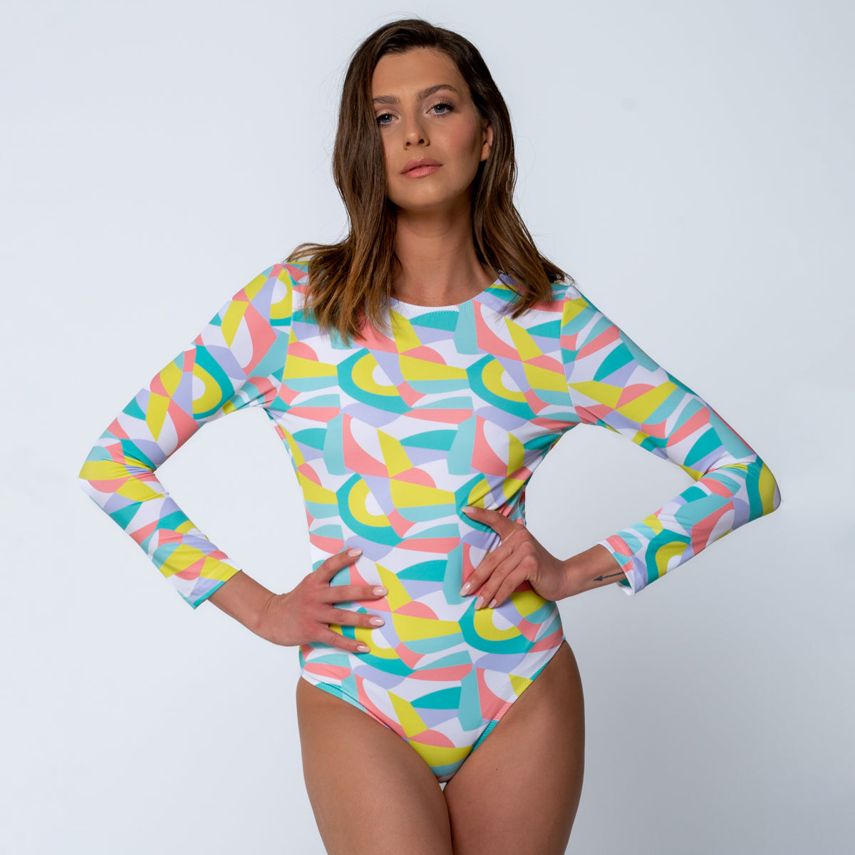 Long-sleeved surf suit Round open back, fastening on the back of the neck Sun protection UPF 50+UV Fully lined Comfortable to wear from day to night Model is wearing a size S